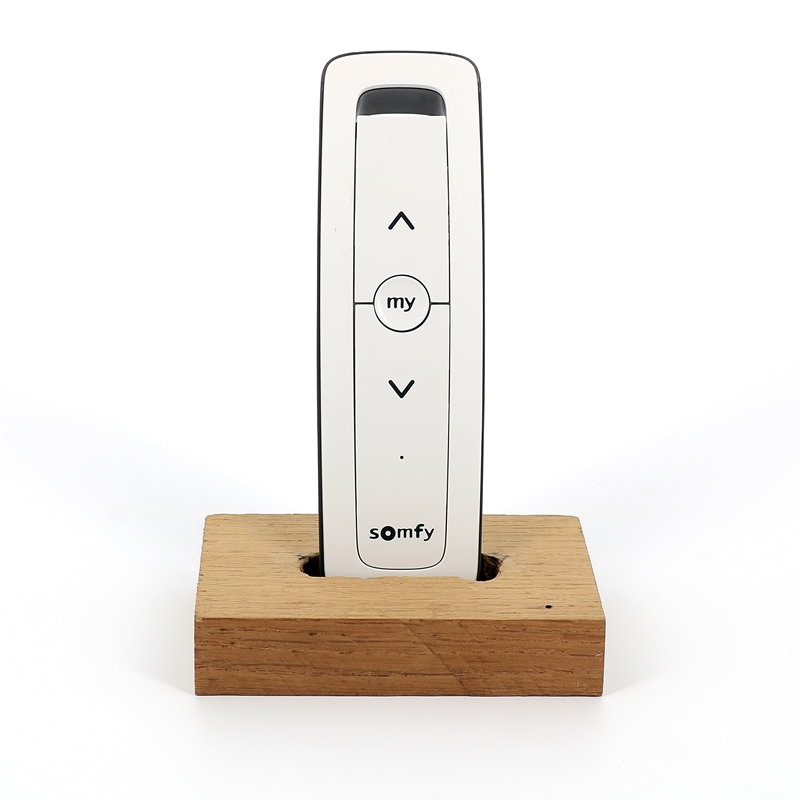 Portatif, c'est un émetteur radio qui permet de contrôler ses équipements à distance. Pour plus de praticité, la télécommande est livrée avec un support mural discret à fixer sans perçage grâce aux bandes adhésives prévues au dos. La télécommande se "clippe" très facilement sur son support et se fond parfaitement dans l'intérieur de la pièce.
